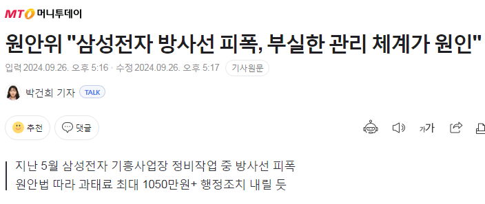 "원안위는 기흥사업장이 정비 중 방사선 안전 관리·감독 절차가 미비했던 것으로 보고 작업자 피폭과 안전조치 미준수 등에 과태료를 부과하는 한편, 경위가 확인되지 않은 임의 조작 건은 검찰에 수사 의뢰를 검토하기로 했습니다. - sbs"