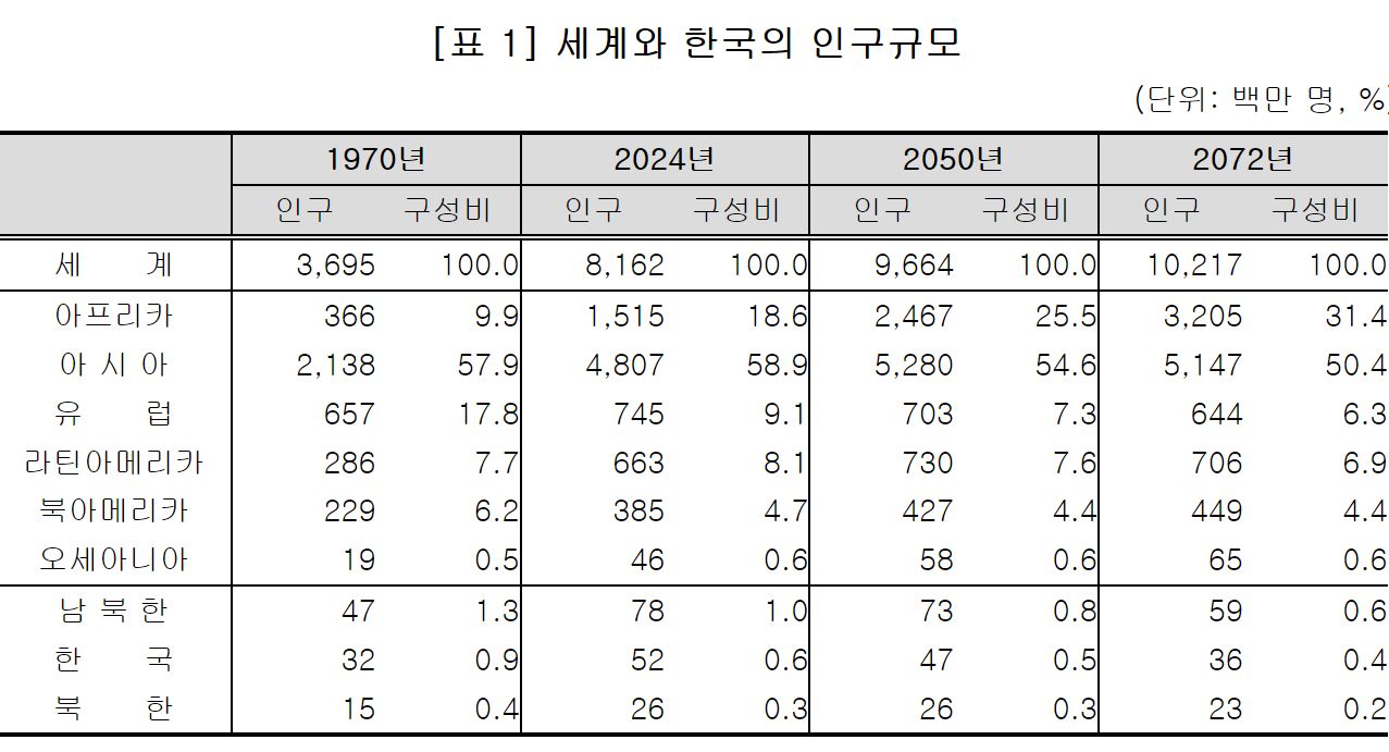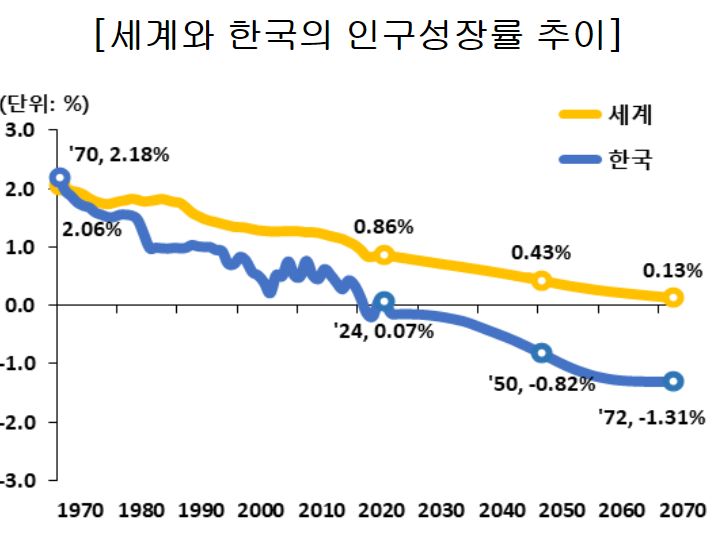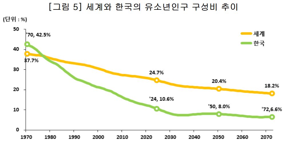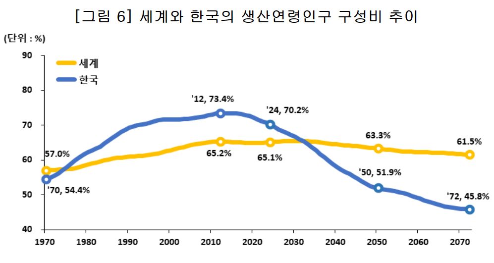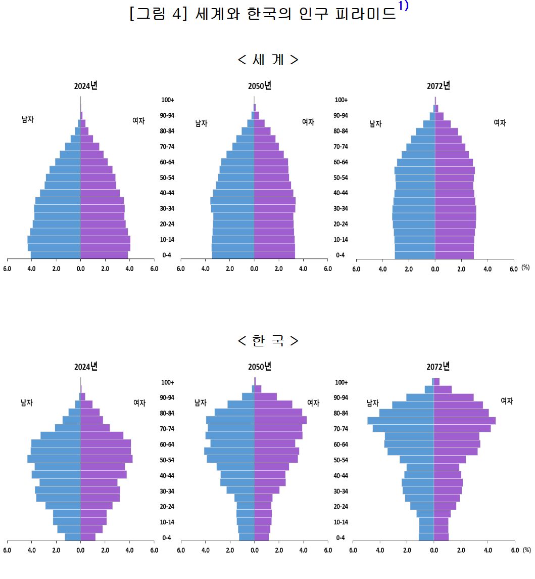 중위 연령도 큰 차이가 날 것으로 보인다. 세계 인구의 중위 연령은 2024년 30.6세에서 2072년 39.2세로 높아지지만, 한국 인구의 중위연령은 2024년 46.1세에서 2072년 63.4세로 오를 것으로 예측됐다.