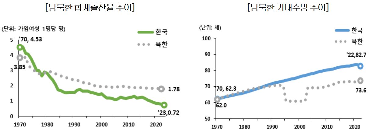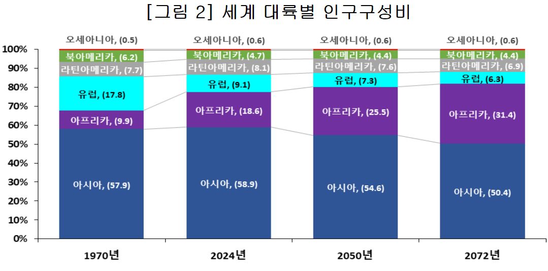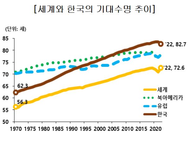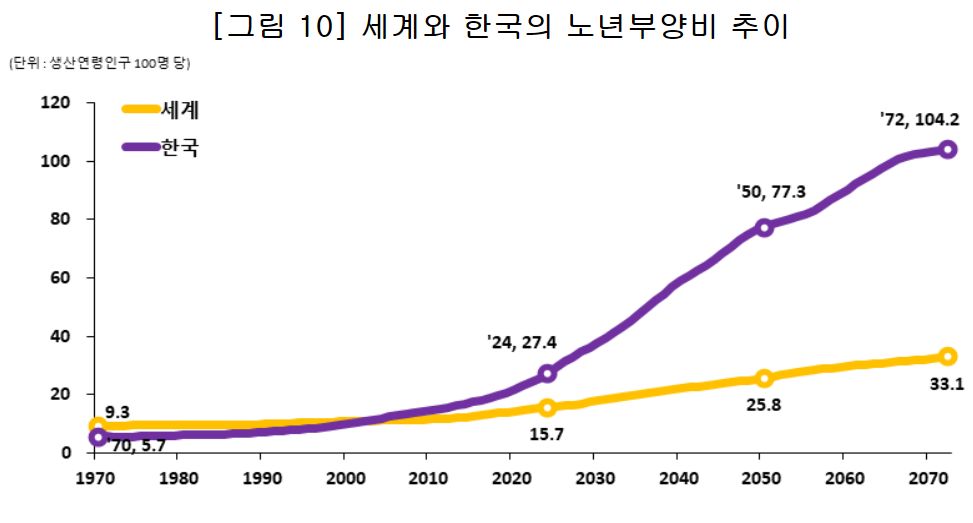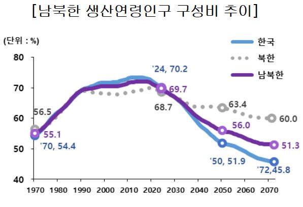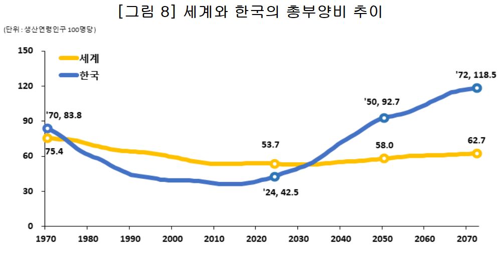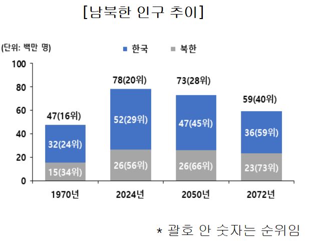 중위 연령도 큰 차이가 날 것으로 보인다. 세계 인구의 중위 연령은 2024년 30.6세에서 2072년 39.2세로 높아지지만, 한국 인구의 중위연령은 2024년 46.1세에서 2072년 63.4세로 오를 것으로 예측됐다.