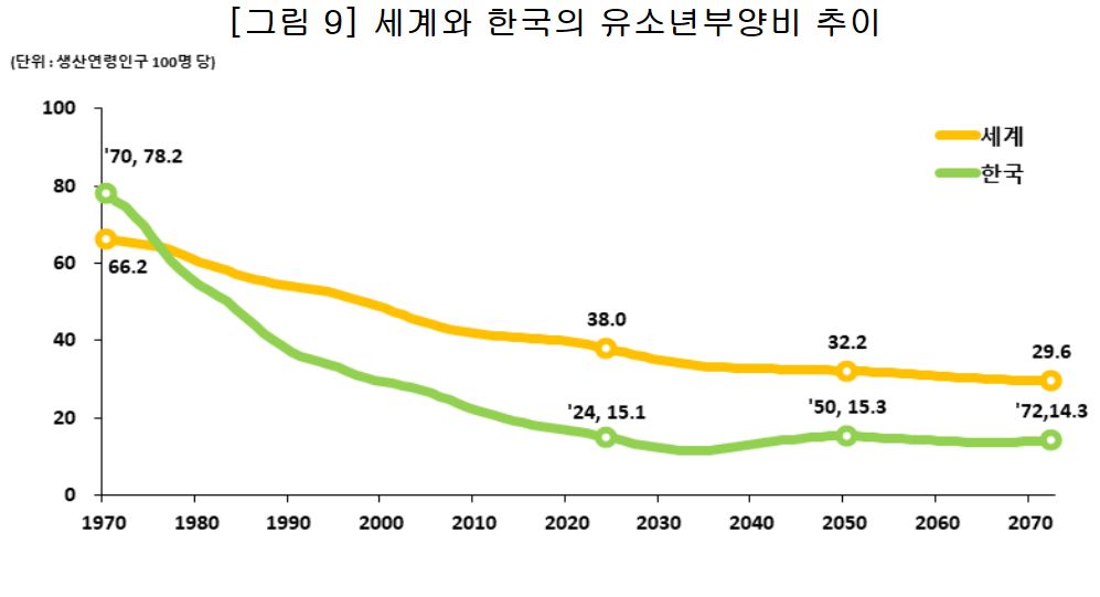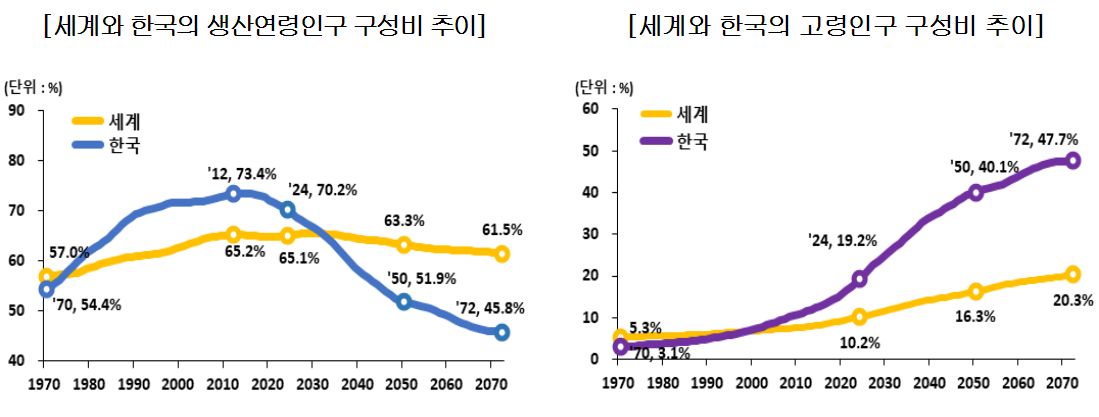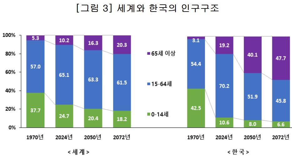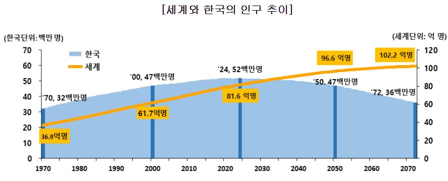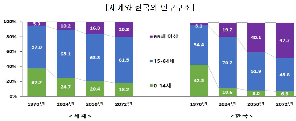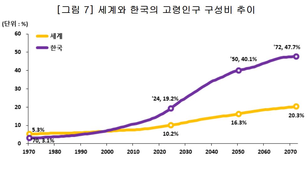 한국 인구는 양적으로 줄어드는 동시에 질적으로는 고령화할 것으로 전망된다. 올해 세계인구 중 65세 이상 고령인구가 차지하는 비중은 10.2%지만, 2072년엔 이 비중이 20.3%로 두 배 가까이 늘어날 전망됐다. 같은 기간 한국의 고령인구 비중은 19.2%에서 47.7%로 치솟을 것으로 예상됐다.