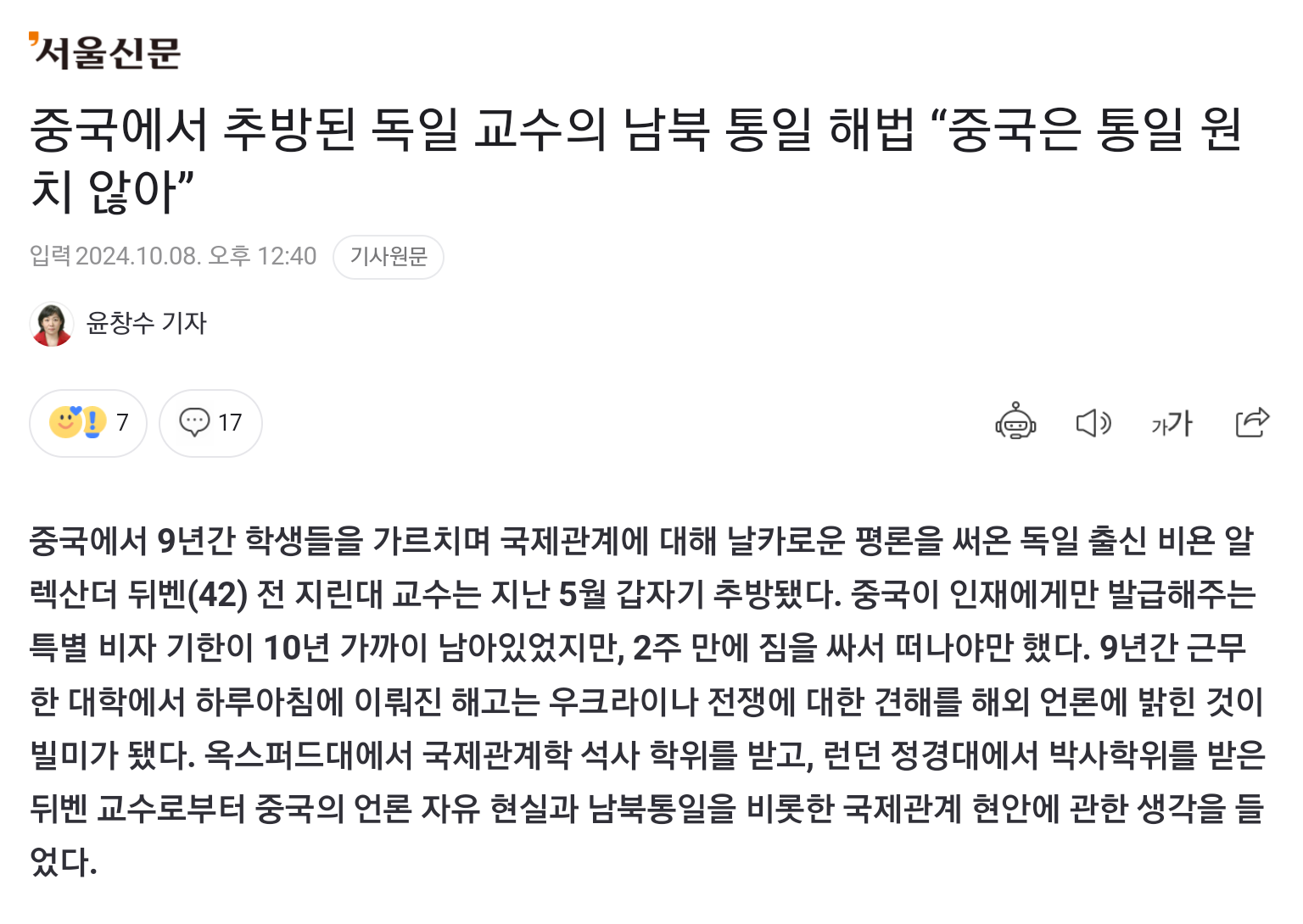 중국에서 추방된 독일 교수의 남북 통일 해법 “중국은 통일 원치 않아”