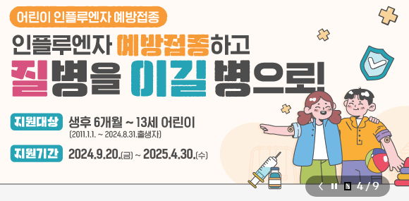 인플루엔자 국가예방접종 지원사업 최종검토일 : 2024-08-26 어린이 2024 - 2025 절기 어린이 인플루엔자 국가예방접종 지원사업 생후 6개월 ~ 13세 어린이는 지정의료기관 및 보건소를 이용하시면 주