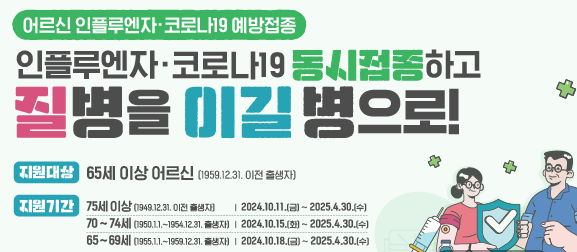 ★ 2024 - 2025 절기 65세 이상 어르신 코로나19, 인플루엔자 동시 국가예방접종 시작/:/ 임신부, 어린이 코로나19 예방접종 본문