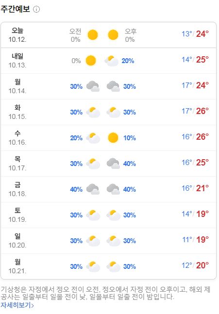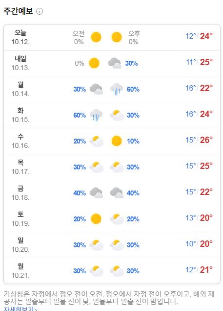 2024.10.13.토.~10.21.화, 날씨: 당분간 이 날씨다가 하순쯤부터 기온이 내려갑니다 본문