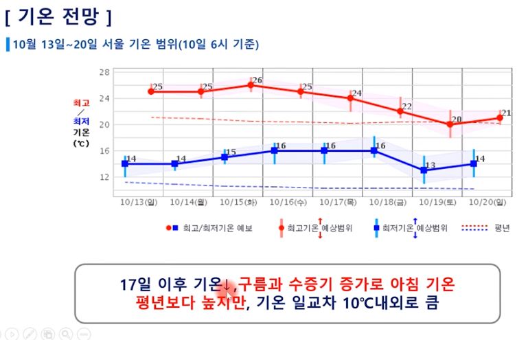 한강에서 소설 읽고 마라톤 등산 가을소풍하기 좋아요! 아침 저녁 뛰는 러닝크루라면 옷차림 조심! (24년 10월 10일 기상청 예보브리핑)