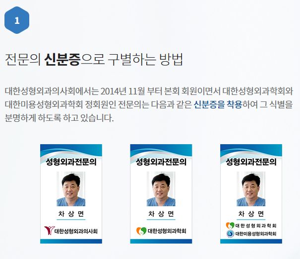 대한성형외과의사회에서는 2014년 11월 부터 본회 회원이면서 대한성형외과학회와 대한미용성형외과학회 정회원인 전문의는 다음과 같은 신분증을 착용하여 그 식별을 분명하게 하도록 하고 있