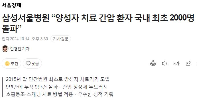 삼성서울병원이 2000명에 달하는 간암 환자를 대상으로 성공적인 치료 성적을 달성할 수 있었던 비결은 이러한 양성자빔의 물리적 특성 외에도 호흡동조, 스캐닝 치료 방법이 꼽힌다 - 서울경제신문