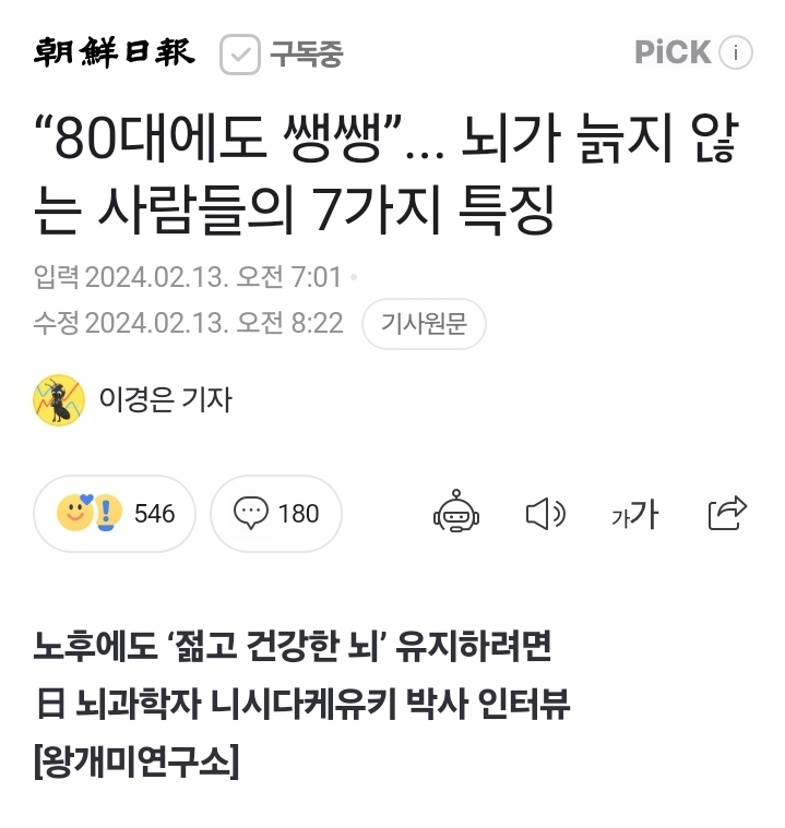 노후에도 ‘젊고 건강한 뇌’ 유지하려면 日 뇌과학자 니시다케유키 박사 인터뷰 “나이 드니 사는 게 따분해. 죽는 날만 기다리고 있어.” “뭘 해도 즐겁지 않고 사소한 일에도 화가 나고 짜