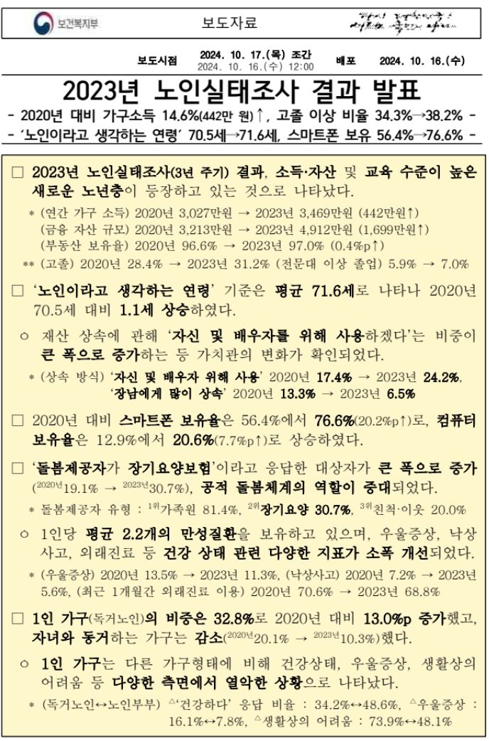 2023년 노인실태조사 결과 발표 < 일반 < 보도자료 < 알림 : 보건복지부 대표홈페이지
