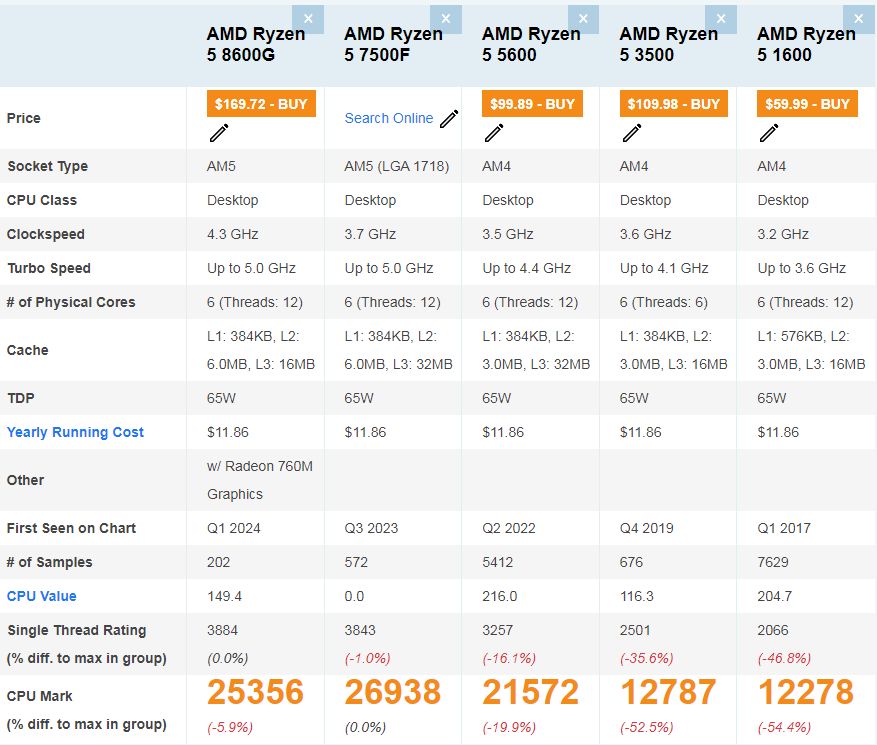 AMD Ryzen 5 8600G, 7500F, 5600, 3500, 1600 passmark cpu 점수 본문