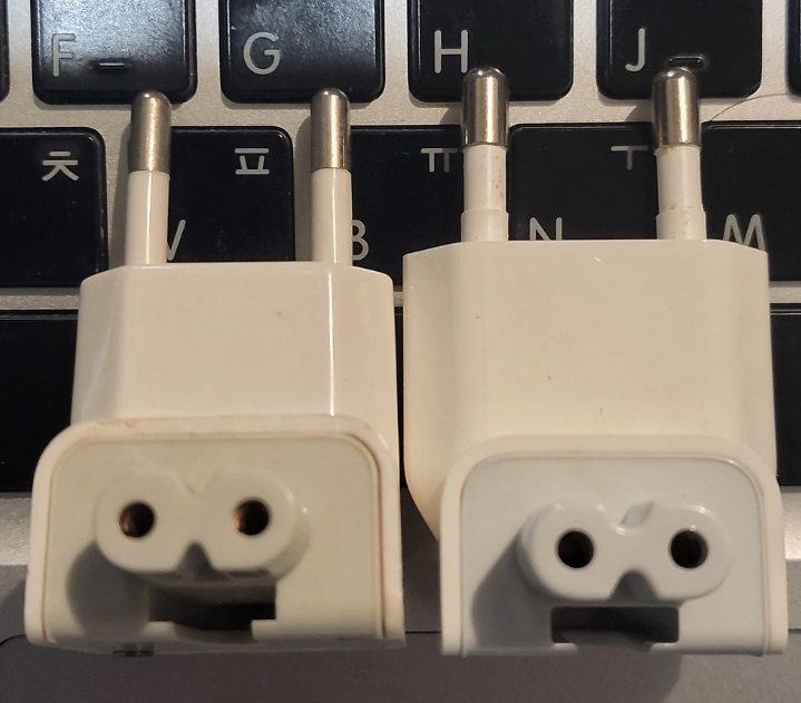 예를 들어, 옛날 맥북에 딸린 애플 번들 어댑터용으로 꽂는 플러그 파트는, 당연하지만, KR 규격과 EU규격 플러그가 다릅니다.