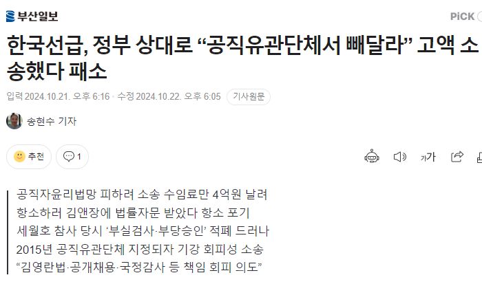 정부의 선박 및 선박장비 검사를 대행하는 비영리사단법인 한국선급(KR)이 공직유관단체 지정 취소를 위해 정부공직자윤리위원회와 인사혁신처를 상대로 고액 소송을 제기했다 패소하고, 이후