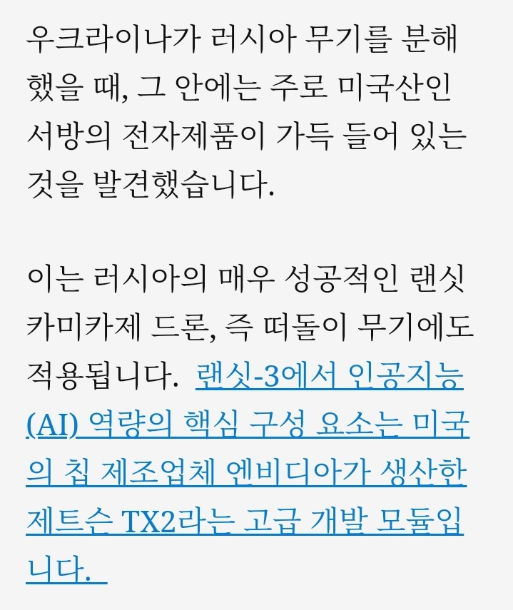 러시아의 nVidia 칩을 사용한 AI 자폭드론 기사. 반 년 전 본문