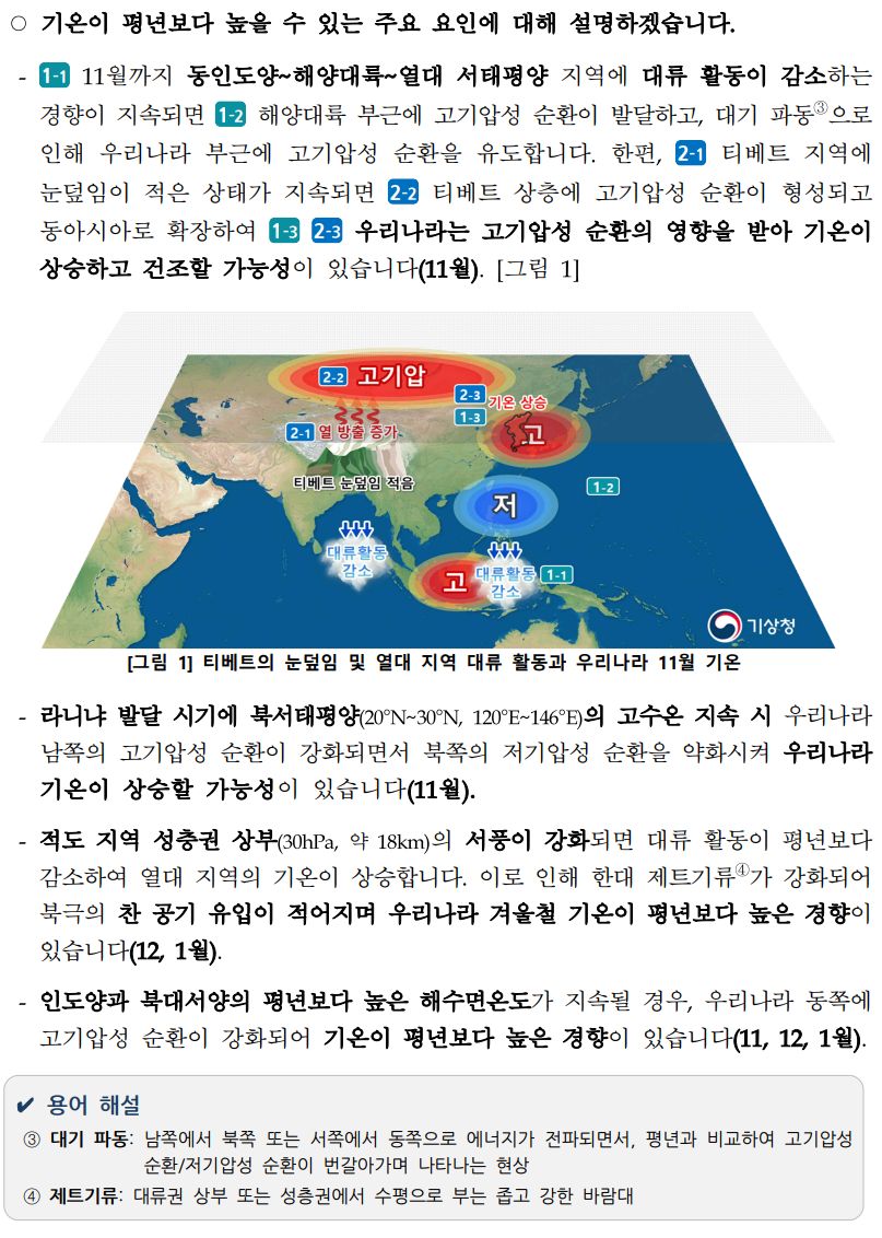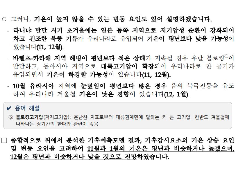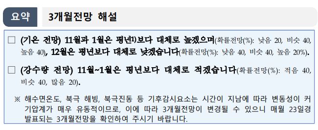 그런데, 오늘 찾아본 기상청 3개월 전망 예보를 보면, 올겨울 기온은 12월은 평년보다 낮겠지만, 11월과 1월은 평년보다 높을 가능성을 이야기하고 있네요.