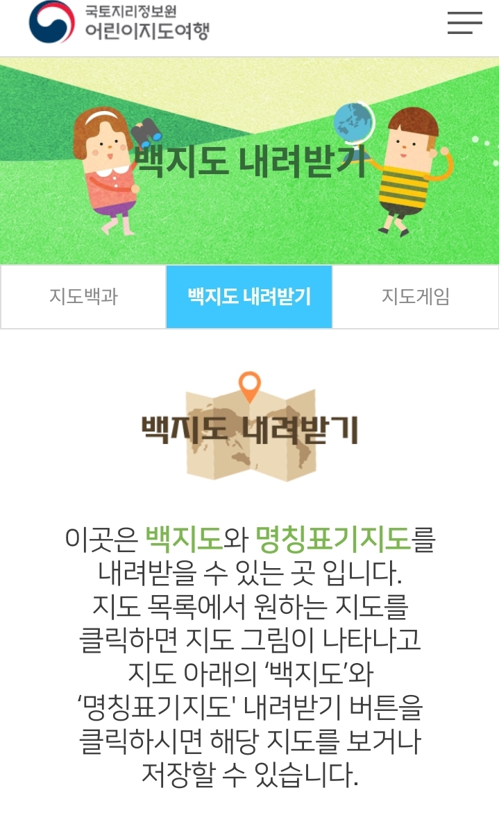이곳은 백지도와 명칭표기지도를 내려받을 수 있는 곳 입니다.지도 목록에서 원하는 지도를 클릭하면 지도 그림이 나타나고 지도 아래의 ‘백지도’와 ‘명칭표기지도' 내려받기 버튼을 클릭