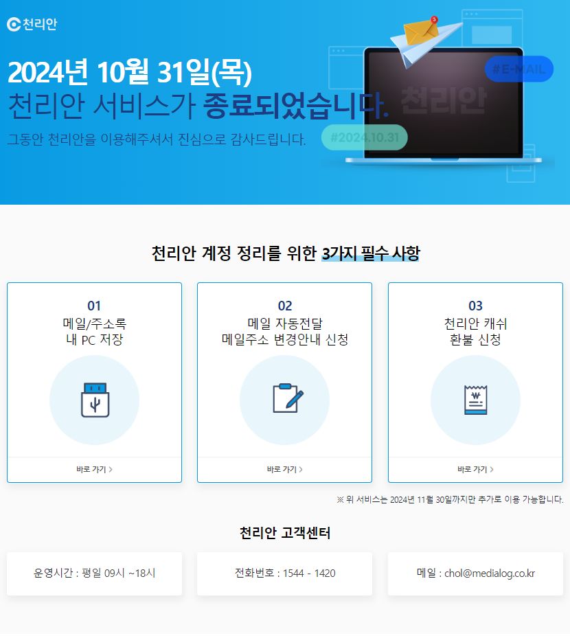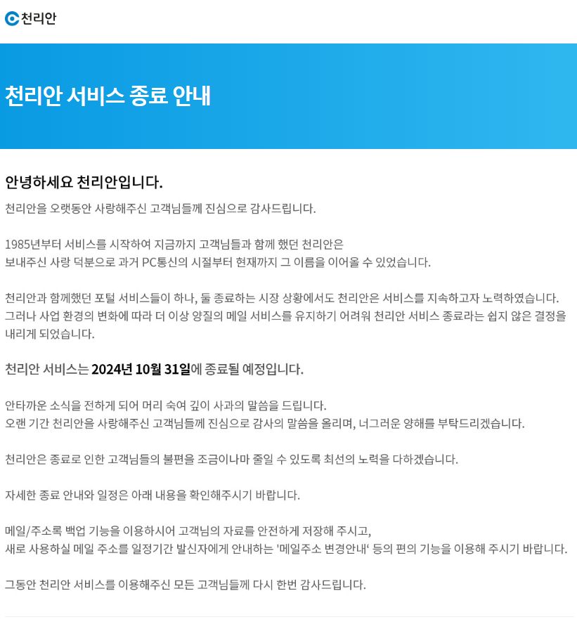 2024.10.31. 천리안(PC통신, 포털사이트) 서비스 종료 본문