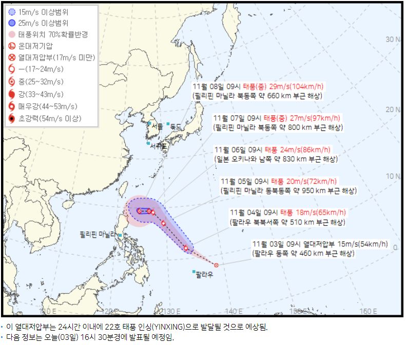 필리핀해에서 발달 중인 열대저압부: 새로운 11월 태풍 예보와 내주 아침 찬바람