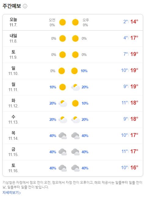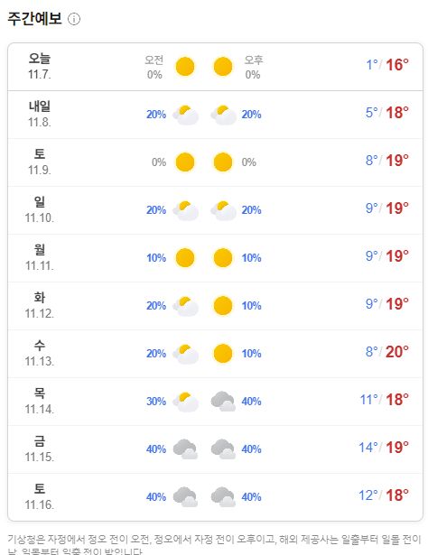 | 주간 날씨: 2024.11.14일 목요일 수능일까지는 한파없음. 다음주부터 추워질듯 (0) | 2024.11.13 |
