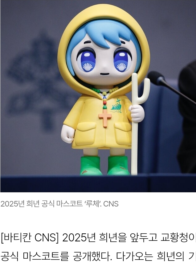 [바티칸 CNS] 2025년 희년을 앞두고 교황청이 공식 마스코트를 공개했다. 다가오는 희년의 기쁜 얼굴을 담은 마스코트의 이름은 이탈리아어 ‘루체’(Luce)로, 빛을 의미한다. 루체는 교회가 젊은이