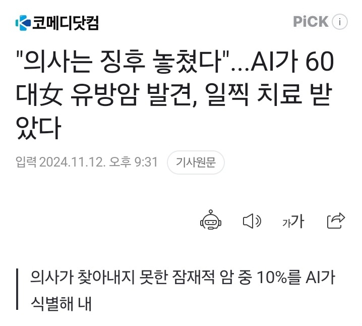 영국에서 (......) AI가 인간이 놓칠 수 있는 암을 발견할 수 있는지 테스트하는 프로젝트에 참여한 병원은 15곳이다. 2개월 프로젝트 동안 방사선과 의사가 정상으로 판단한 1만2000건 이상의 유방조영 검사를 AI 시스템을 사용해 다시 검토했다. 그 결과 임상 패널이 다시 읽어서 초기 검진에서 발견되지 않은 잠재적 암을 식별한 비율은 약 10%에 이르렀다. (......) - 코메디닷컴