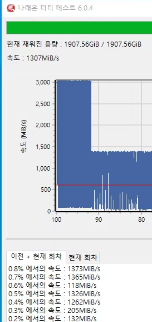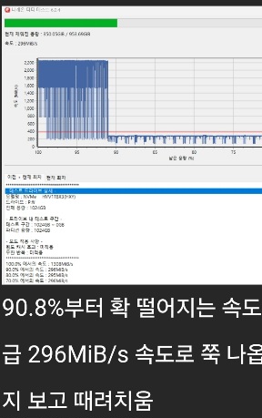 전체용량만큼 성능테스트범위를 늘리거나1 파일복사를 하면 처음 약 10%용량까지 쓸 땐 제조사 광고만큼, 그 다음부터는 SATA SSD의 반절밖에 안 되는 기어가는 속력. ㄷㄷㄷ2