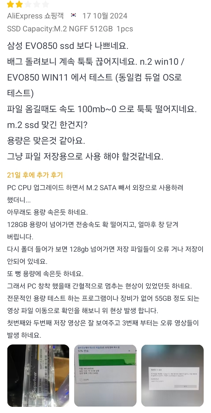 어떤 중국 브랜드 NVMe SSD 성능리뷰글 (링크): 벤치성능 눈속임이 너무 심한 경우 /:/ 그 외 다른 상품들의 용량사기 등 본문