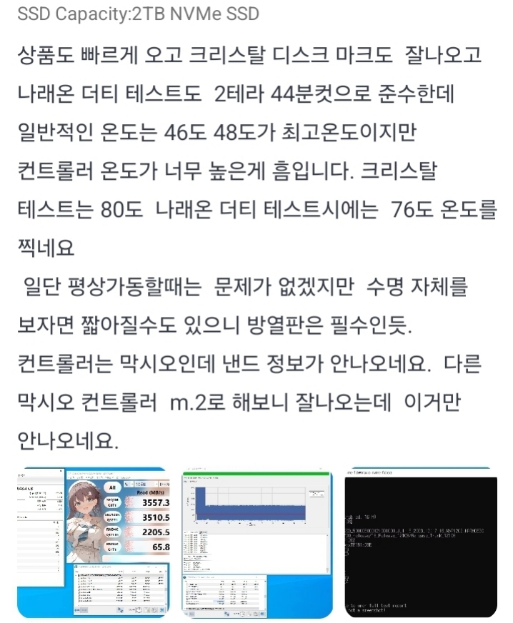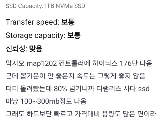 그러면서, 디램리스SATA SSD는 캐시영역을 넘으면 이런 물건보다 훨 느린 전송률이 나오니까 그거보단 낫겠지, 자기처럼 쓸모없는 적립포인트를 쓸 수 있다면 그런 용도로는 soso라는, 작성자말. (단, 장시간 사용 후 후기는 없고, 따로 검색해보지는 않았습니다. 저 사이트는 악용방지용인지 일정기간이 지나면 글과 댓글이 잠기는 것 같기도 하고. 따라서 그 부분은 관심있는 분들이 구글링해보시기를.)