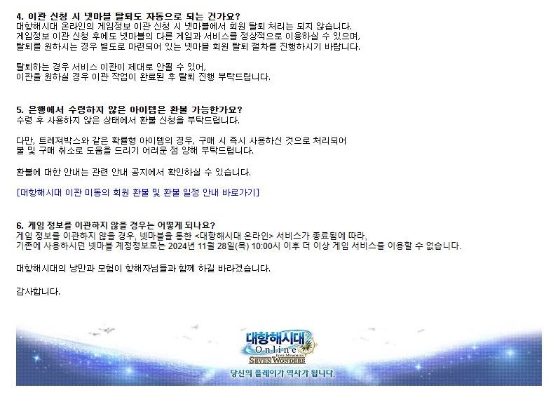 [공지] 대항해시대 이관 미동의 회원 환불 및 환불 일정 안내 2024.10.29