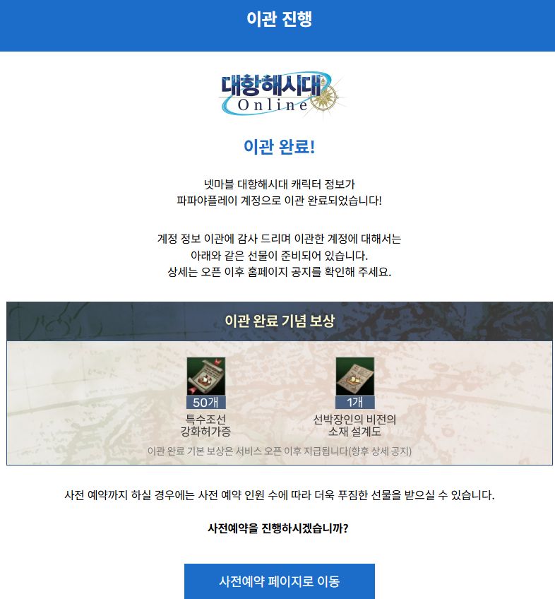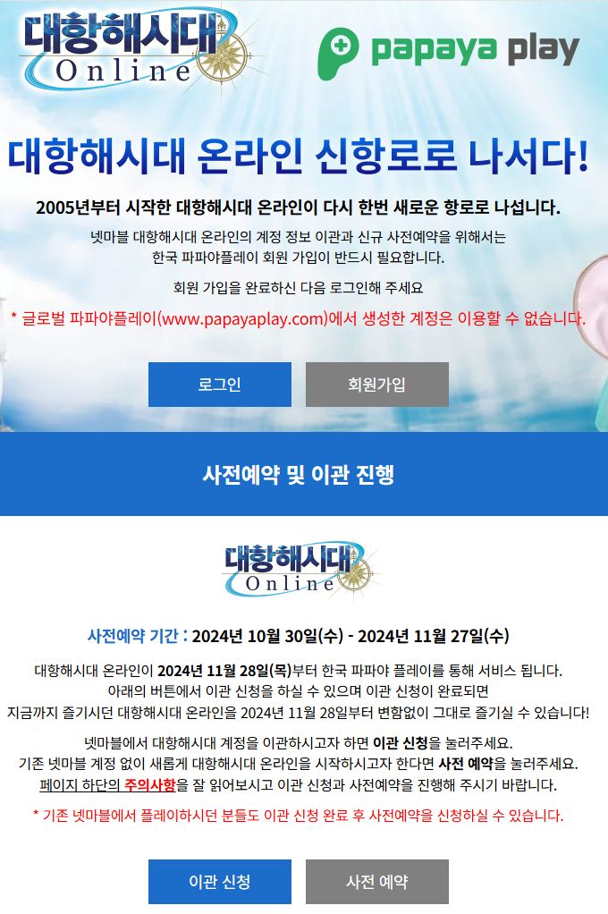 사전예약 및 이관 진행 사전예약 기간 : 2024년 10월 30일(수) - 2024년 11월 27일(수) 대항해시대 온라인이 2024년 11월 28일(목)부터 한국 파파야 플레이를 통해 서비스 됩니다. 아래의 버튼에서 이관 신