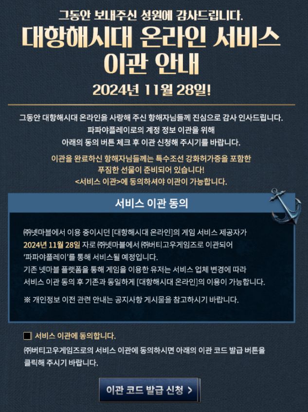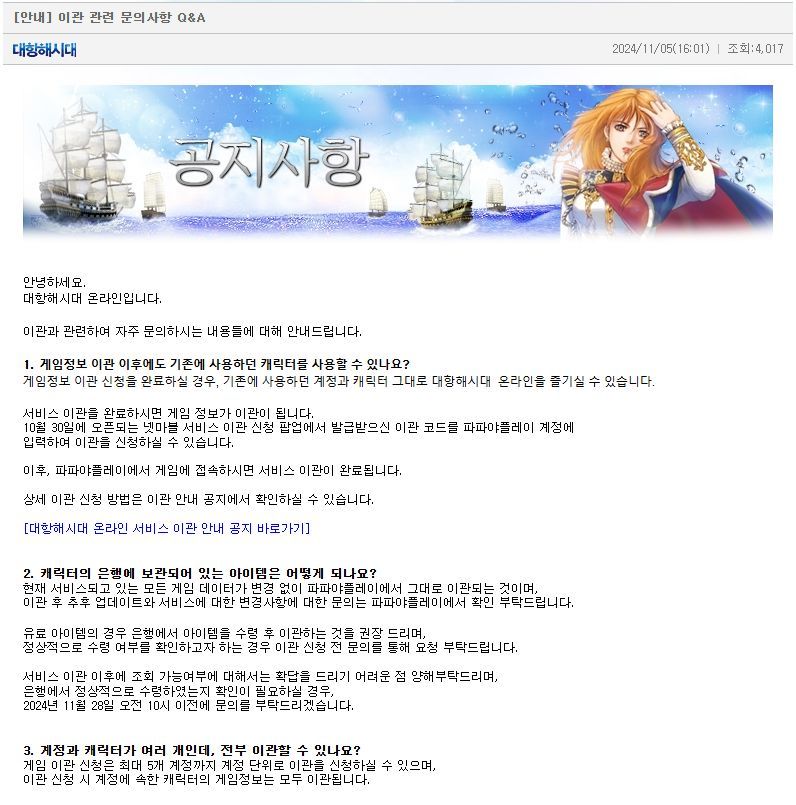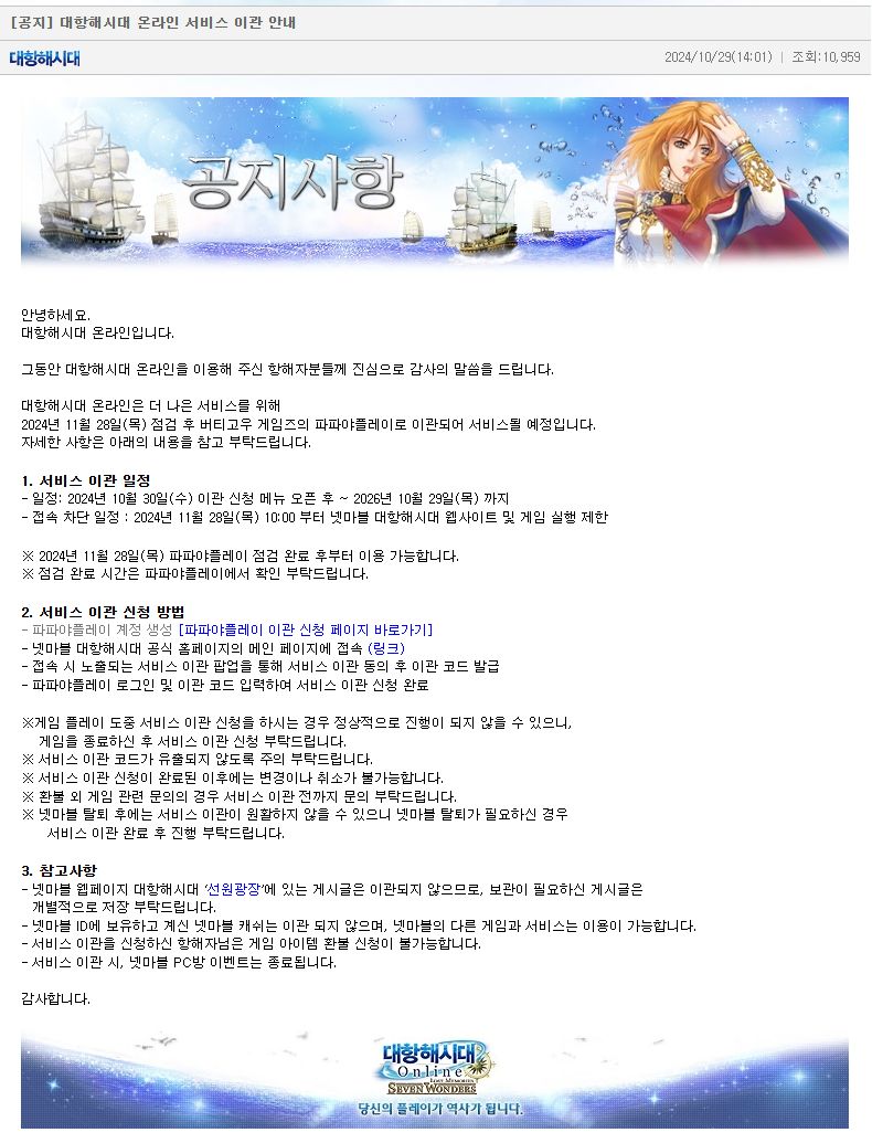 [공지] 대항해시대 온라인 서비스 이관 안내 2024.10.29