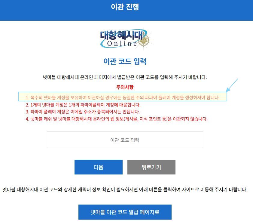 이 주소로 바로 들어가면 안 되고, 반드시 넷마블 사이트의 이관신청을 눌러 코드를 받고 자동으로 넘어가야 합니다.
