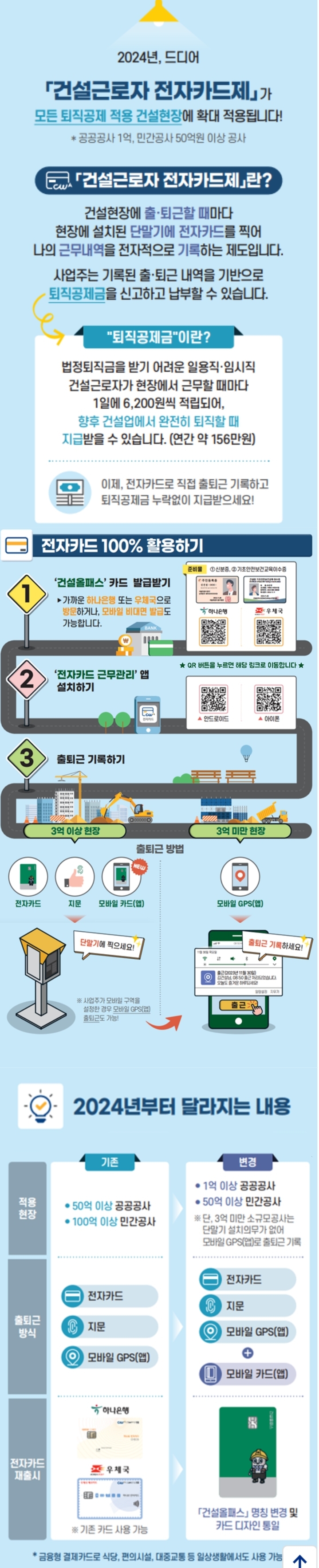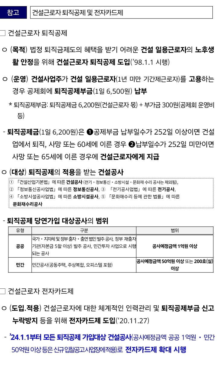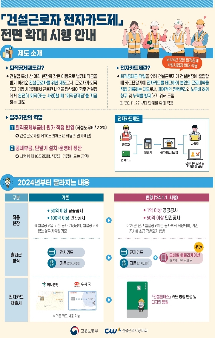 건설근로자 권익 보호를 위해 전자카드제 전면 확대 시행 2024.1.2.: 2024.1.1.부터 모든 퇴직공제 가입대상(공공 1억원, 민간 50억원 이상) 건설공사에 적용