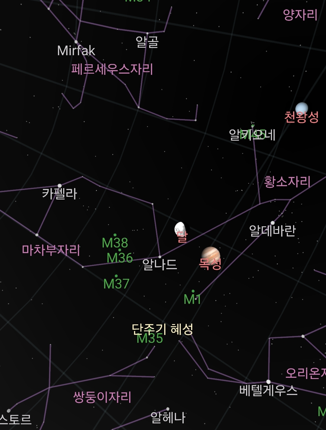 카펠라, 달, 목성, 알데바란.