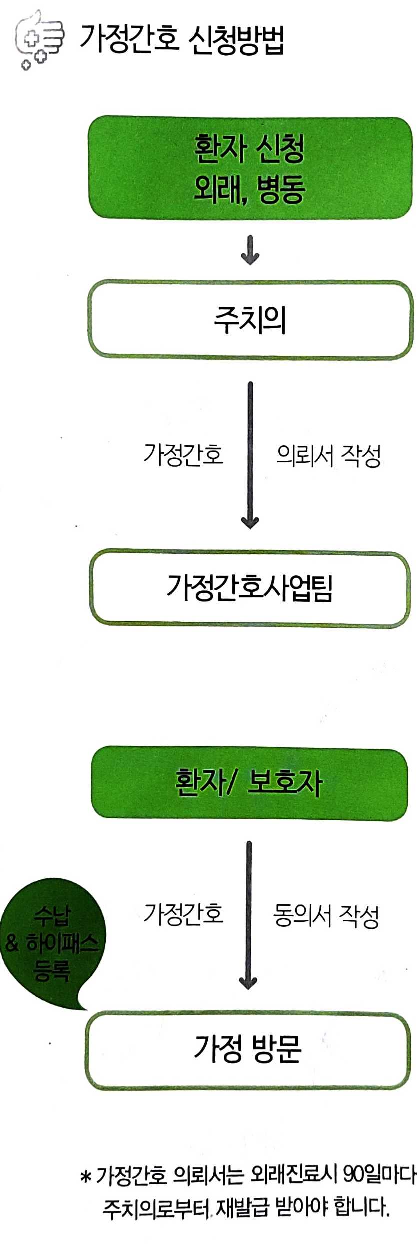 가정간호 의뢰서는 외래진료시 90일마다 주치의로부터 재발급 받아야 합니다.