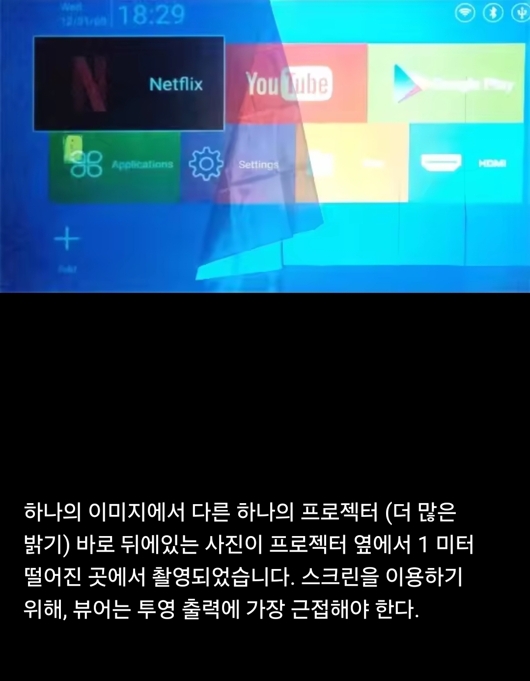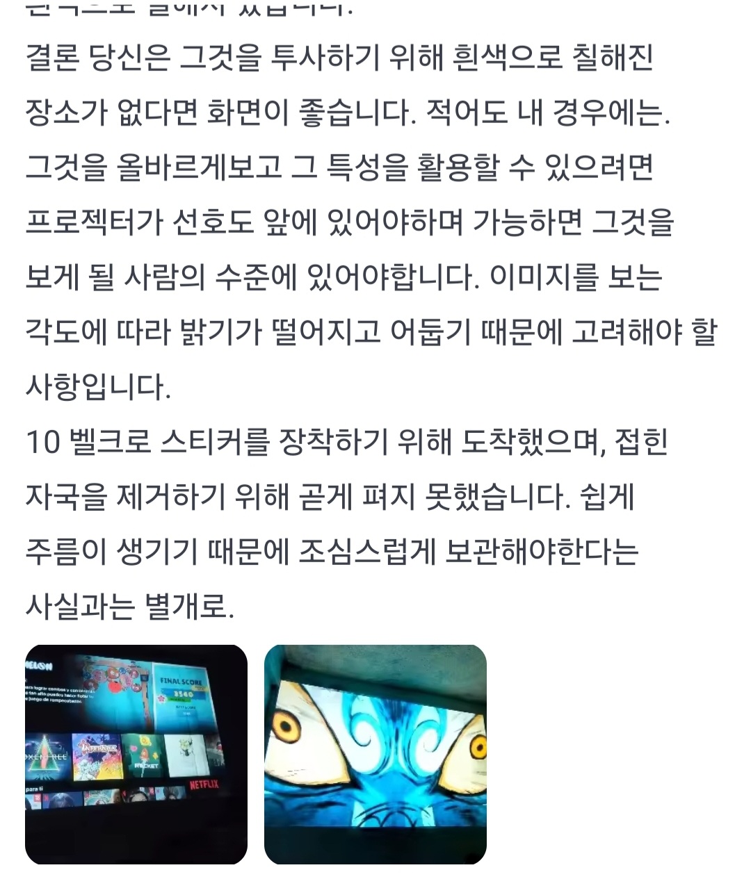 하지만 당연히 흰색보다는 빛반사가 적다. 그 말은 프로젝터 출력이 작으면 전체적으로 어둡게 보이는 큰 단점이 있다는 것. 따라서 일단 화면이 밝기를 바라는 저출력 미니프로젝터에는 보통 그렇게 어울리지는 않는 것이라고.
