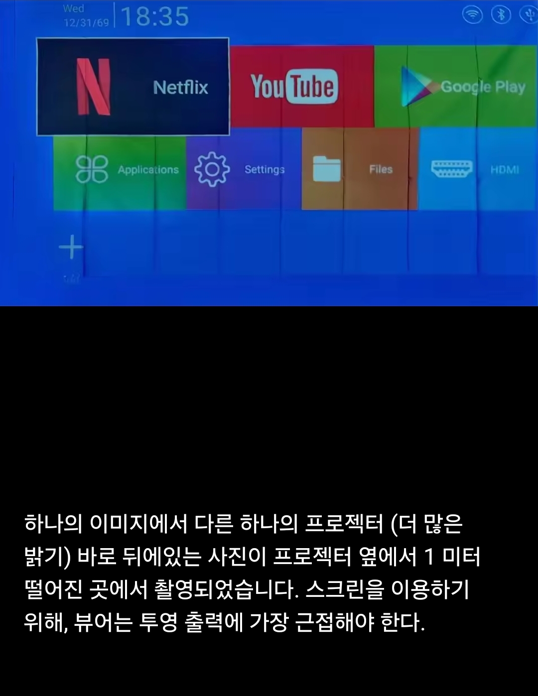 위 화면에서 흰색벽이 더 뿌얘보이고 회색 색감이 나아보이는 건 아마, 불 다 끄고 프로젝터만 켜고 찍은 게 아니라서 주변 조명이 있기 때문일 것이다.