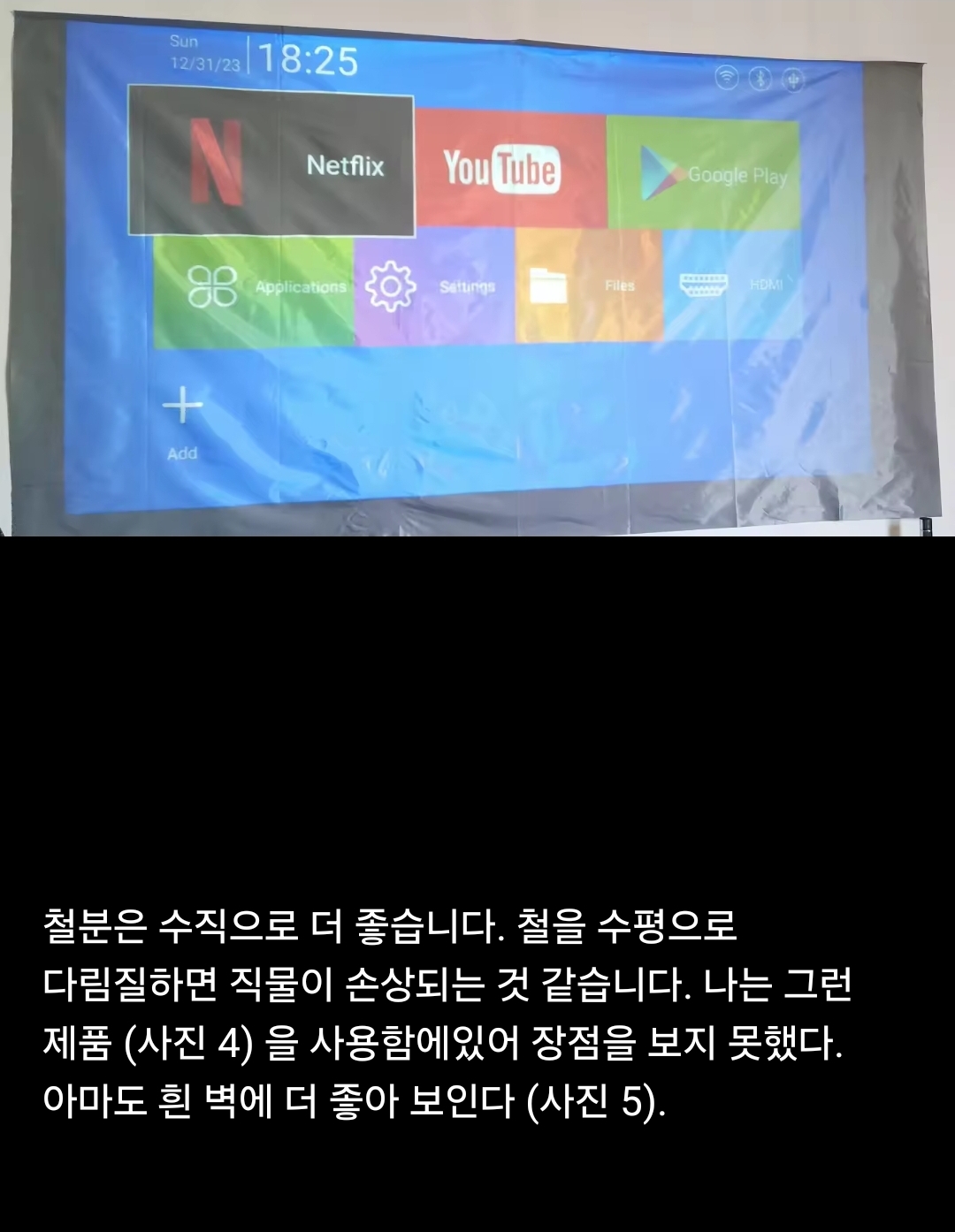 몇 천 원에서 1만원대 정도 하는 싸구려 회색 스크린은, 이미 흰 색 벽에 투사하거나 하얀색에 가까운 계열 벽지를 붙여놓은 집이라면 쓸 필요없다는 교훈.