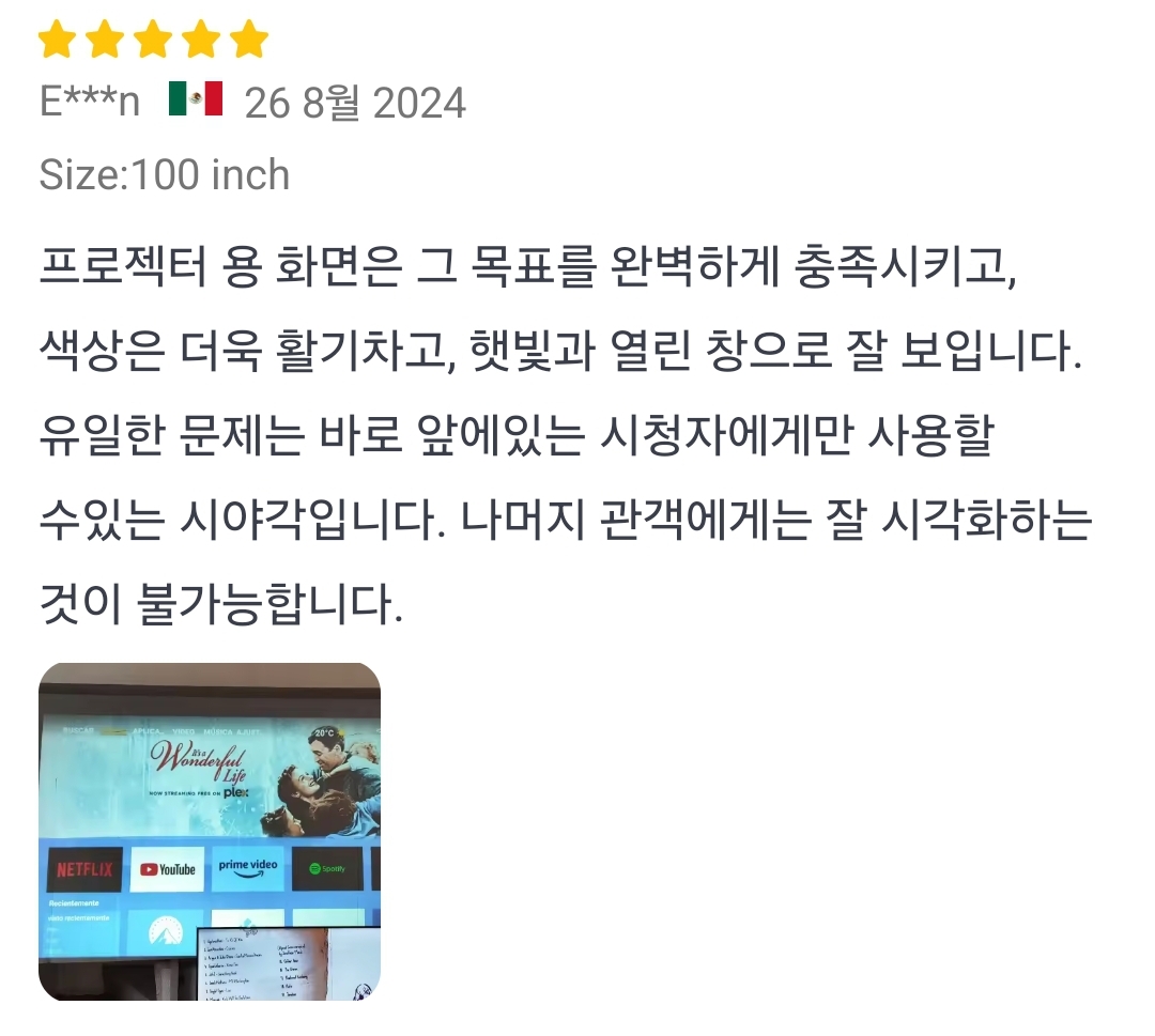 ㅡ 글라스비드 코팅 스크린.. 영상을 투사한 프로젝터 방향으로 빛을 반사한다. 따라서 천장에 매달아둔 프로젝터가 쏘는 집에서는 쓰면 안 된다. 프로젝터가 내 옆이나 앞에 있을 때 사용하는 것. 시야각이 매우 좁아서 프로젝터가 나와 다른 1인 사이에 놓여있는 배치일 때만 좋다고.
