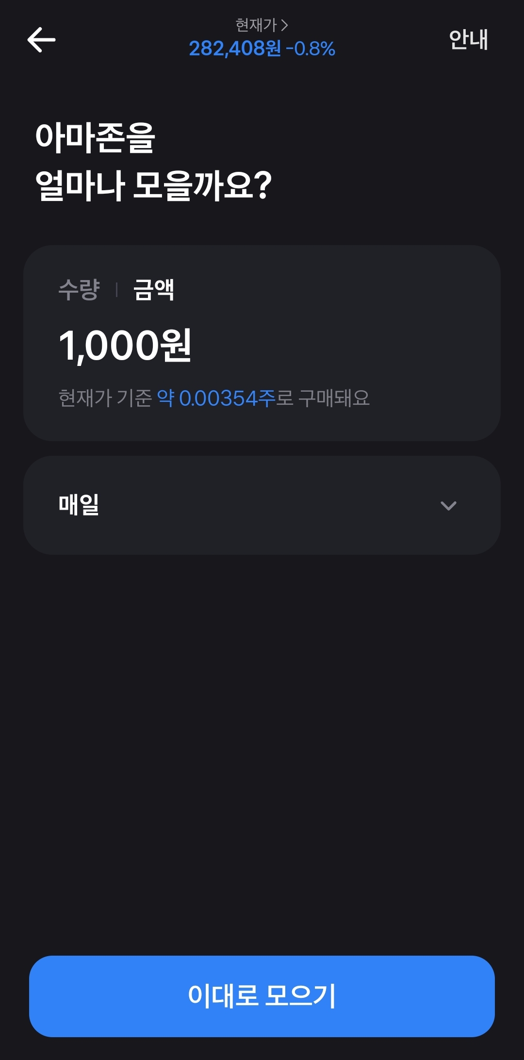 미국주식인 아마존은 1천원단위로 살 수 있습니다. 자판기/편의점커피 1잔 ~ 카페 커피 1잔 사이에서 결정 가능. 하루에 1천원도 되고 1주일에 1천원도 됩니다.