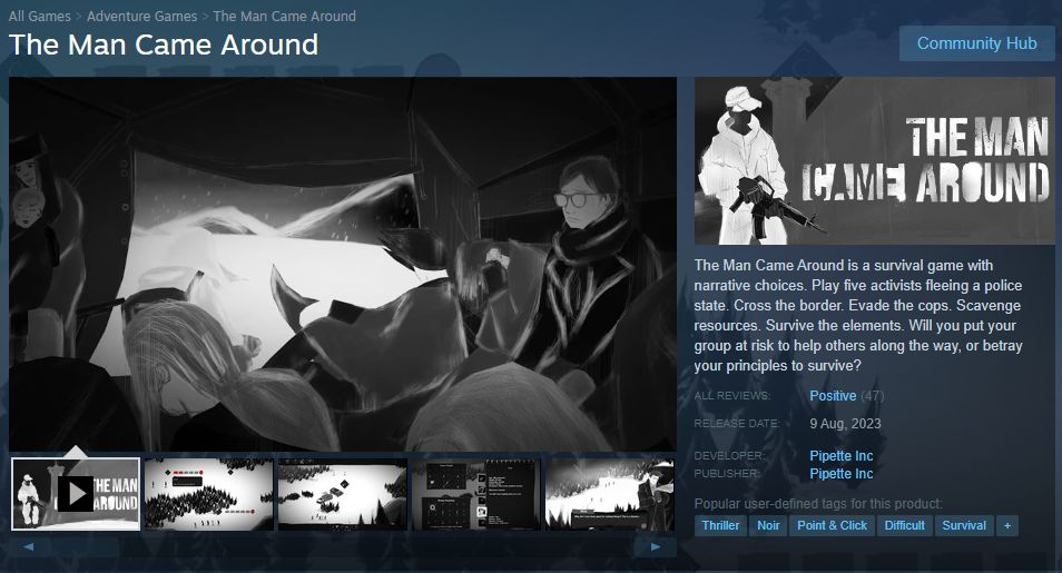 The Man Came Around is a survival game with narrative choices. Play five activists fleeing a police state. Cross the border. Evade the cops. Scavenge resources. Survive the elements. Will you put your group at risk to help others along the way, or betray y