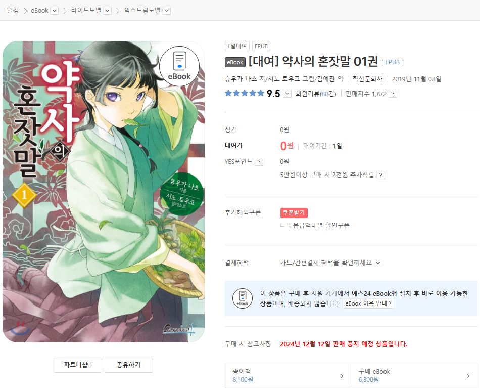 약사의 혼잣말 (휴우가 나츠) 1권 1일 무료대여. (~12월 11일까지) 본문