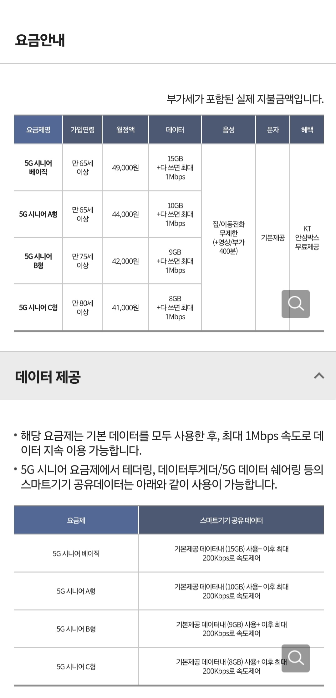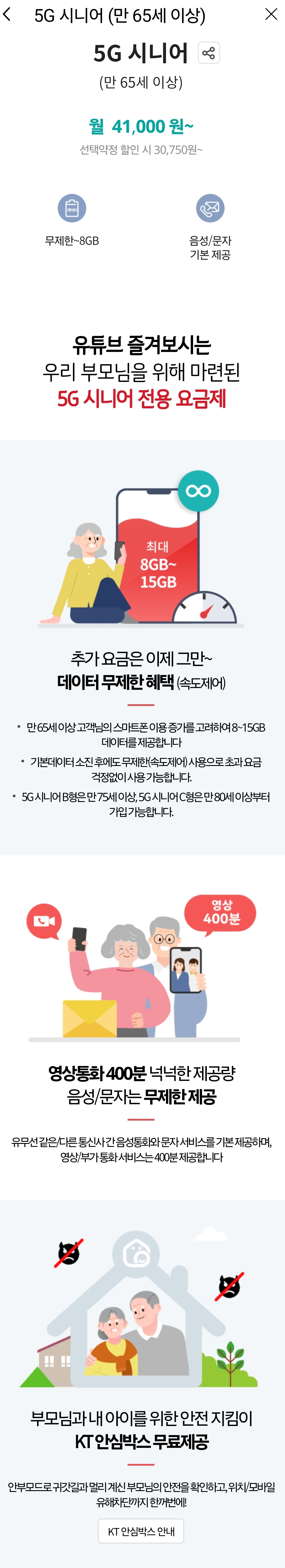 KT 5G 시니어 (만 65세 이상) 요금제 월 41,000 원~ (선택약정 할인 시 30,750원~) 본문