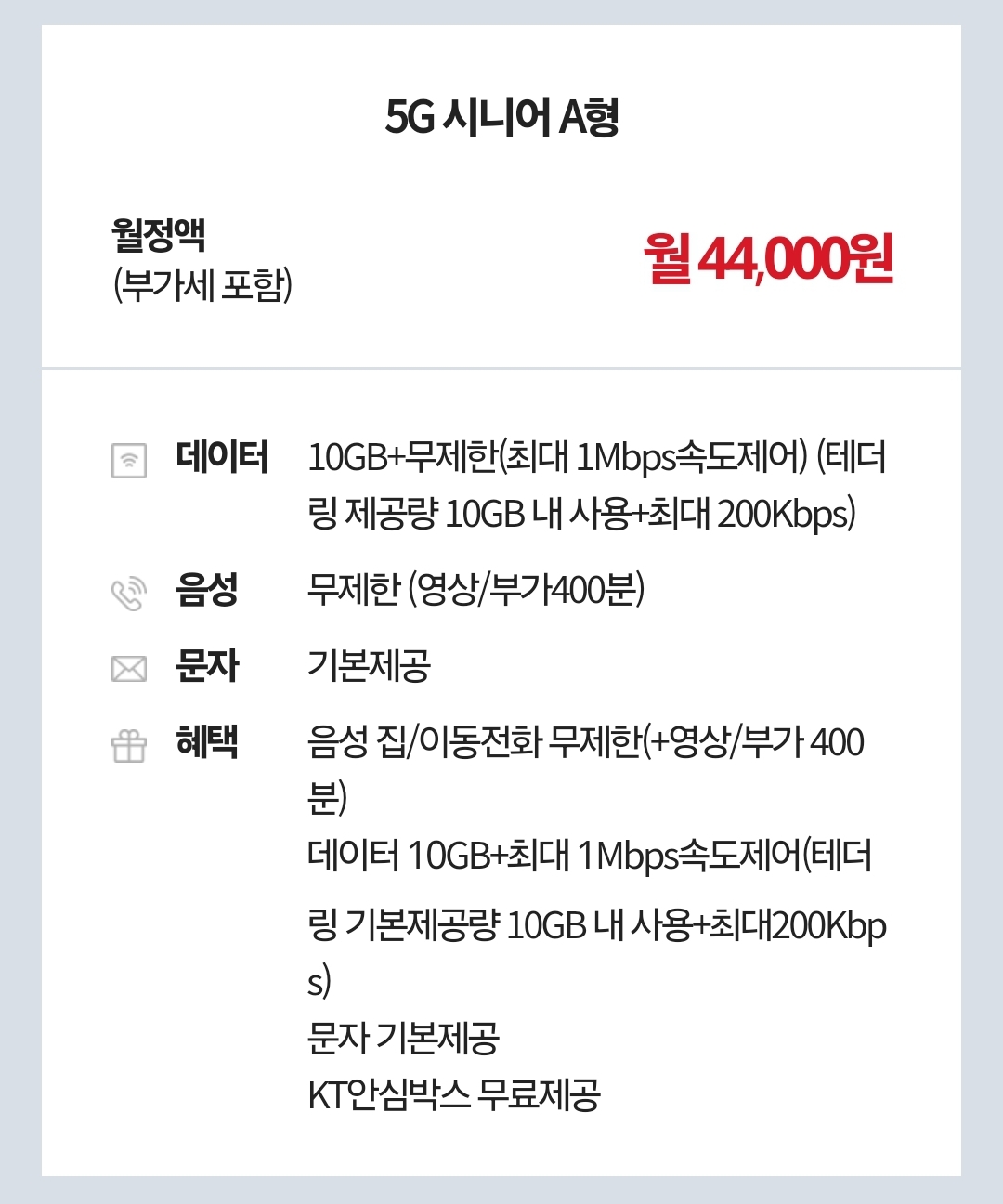 KT 5G 시니어 (만 65세 이상) 요금제 월 41,000 원~ (선택약정 할인 시 30,750원~) 본문