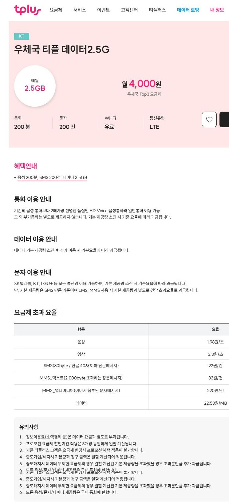 우체국 티플 데이터2.5G (200분, 200건, 데이터 2.5GB).. 4천원