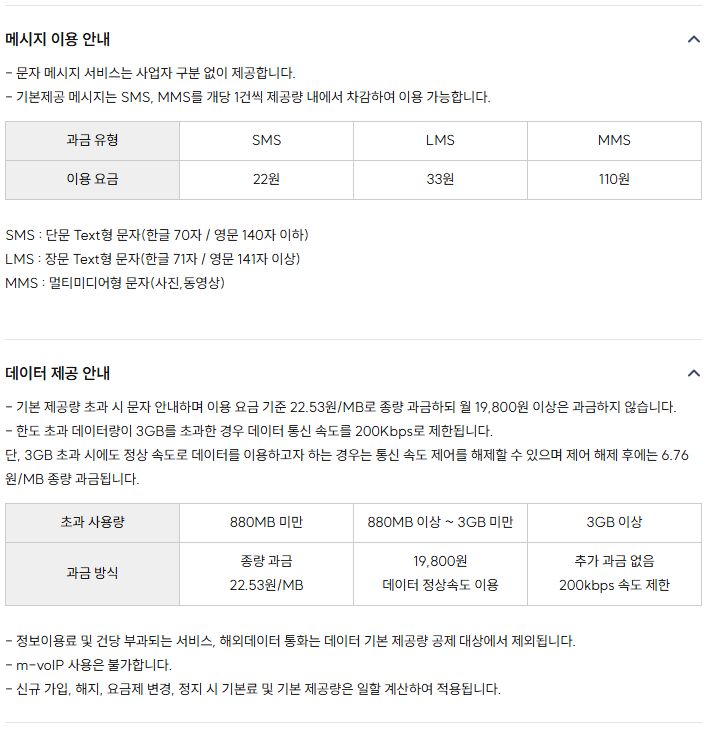 물론 기본제공량을 넘어서면 일반적인 문자메시지 요금표대로 계산합니다.
