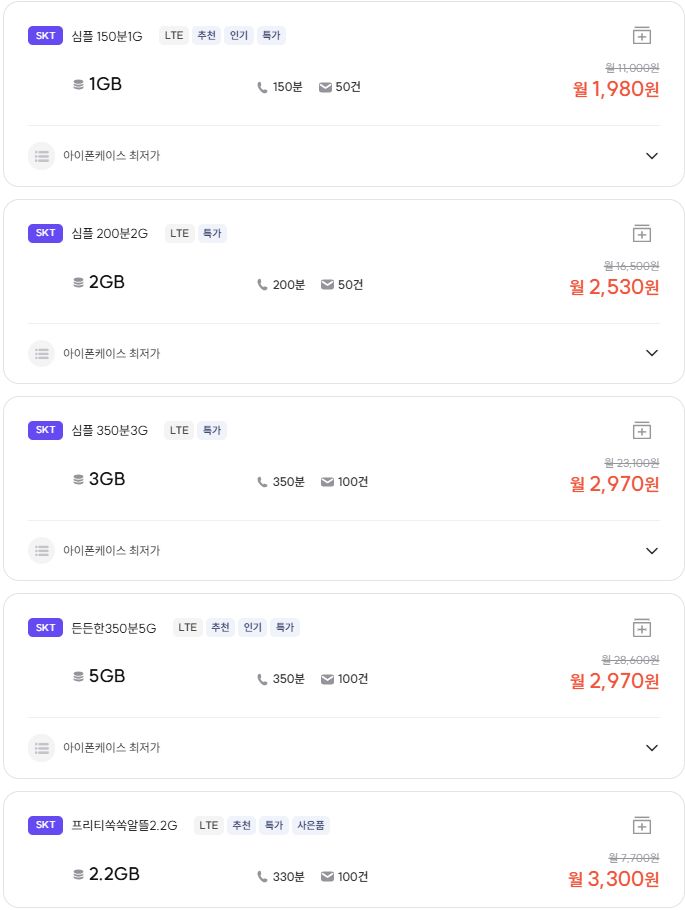 KT 스카이라이프( https://shop.skylife.co.kr/mvno/usimPayPlan )