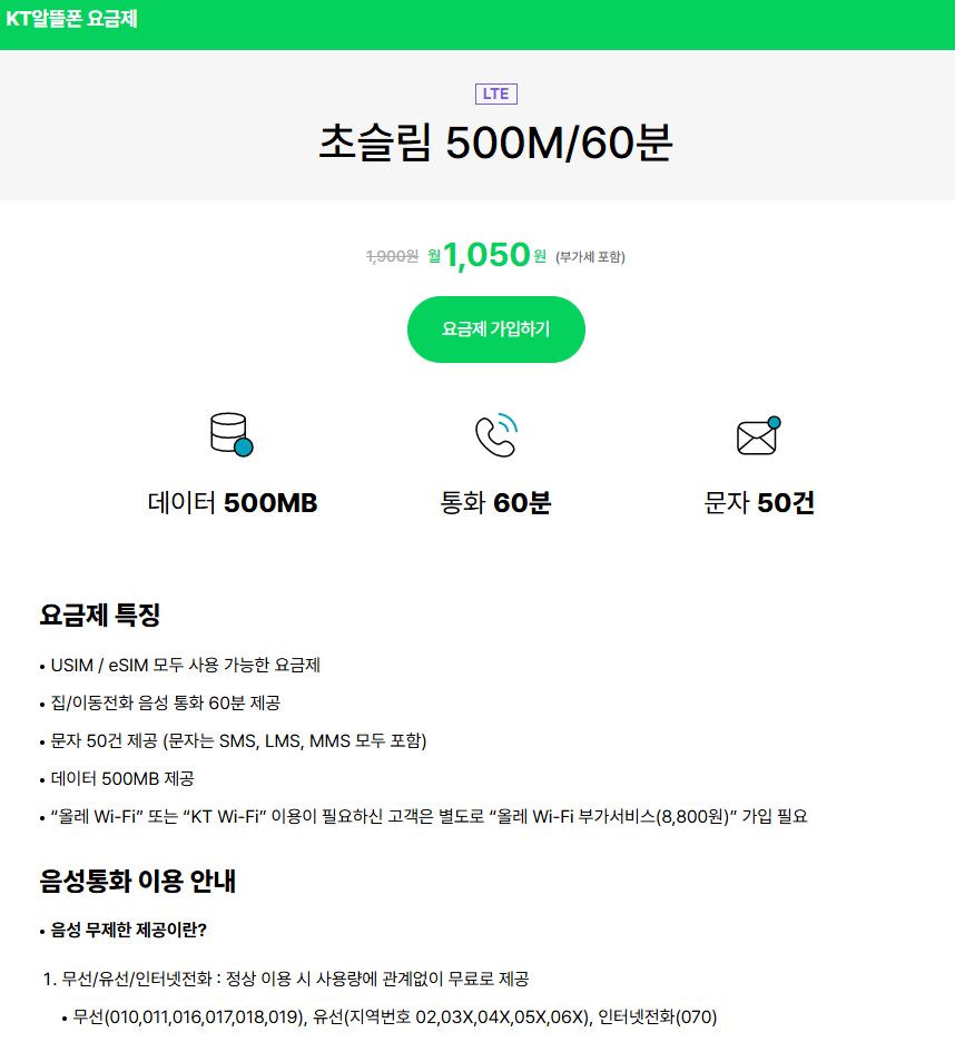 (스카이라이프) 초슬림 500M/60분 (통화 60분, 문자 50건, 데이터 500MB) .. 1050원