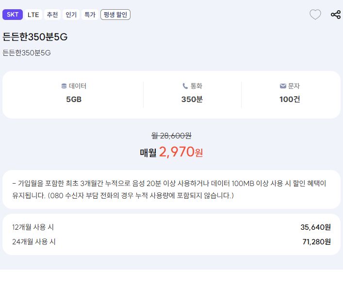 (프리티) 든든한350분5G (350분, 100건, 5GB) .. 2970원