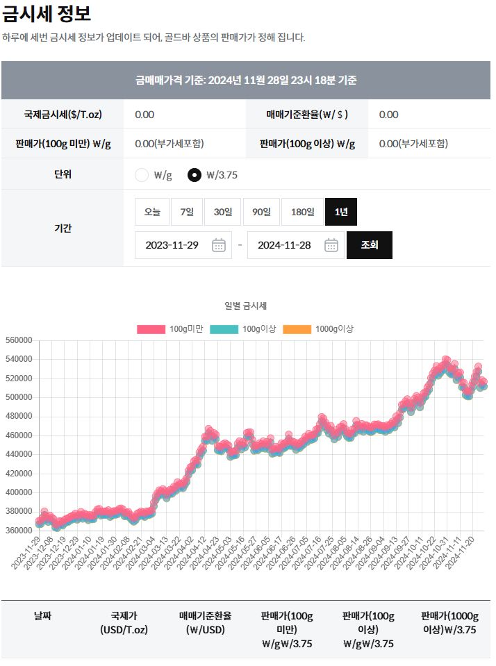 고시기준일 : 2024.11.26 , 단위(%, g/원) 적용시간 기준가격 (원/gram) 매입가격(원/gram)[고객이 금을 살 때] 매도가격(원/gram)[고객이 금을 팔 때] 금가격(USD/트로이온스) 원달러환율(₩/USD) 19:11:00 118,130.