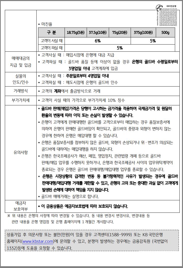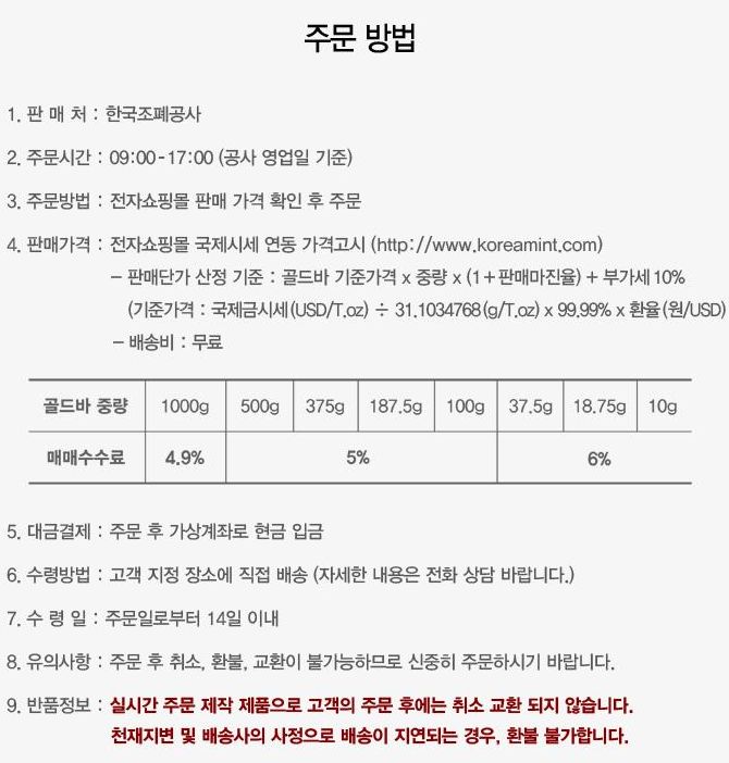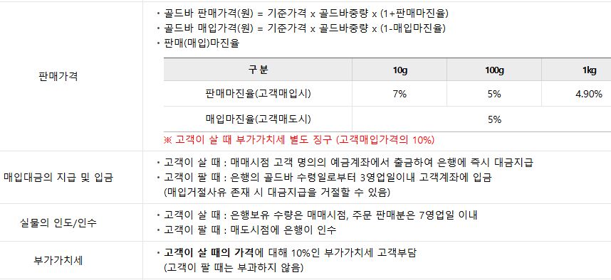 은행 점포에 보유고가 있으면 바로 내주고 없다면 7영업일 이내에 고객이 점포에 재방문해 수령하는 듯. KB은행과 수수료율이 다르고, 취급 중량도 다른 것을 알 수 있다. 위에 인용한 KB은행것을 보면 거기는 한 돈(3.75g), 석 돈같은 작은 용량은 취급하지 않고 닷돈, 열 돈, 그 이상을 취급했다. 아래 우리은행것을 보면 여기는 10g짜리를 취급한다.